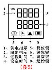 依此,設置工作時間秒位數值;設置完成后靜等最后一位閃動停止,之后,按設 圖2 定起始鍵⑻一次,紅色指示燈⑴閃亮,進入間隔狀態,開始設定值的循環工作狀態。待完成此次工作關機后,控制器會自動記憶設定數值,待下次開機后自動進入已經記憶的設定循環工作狀態。